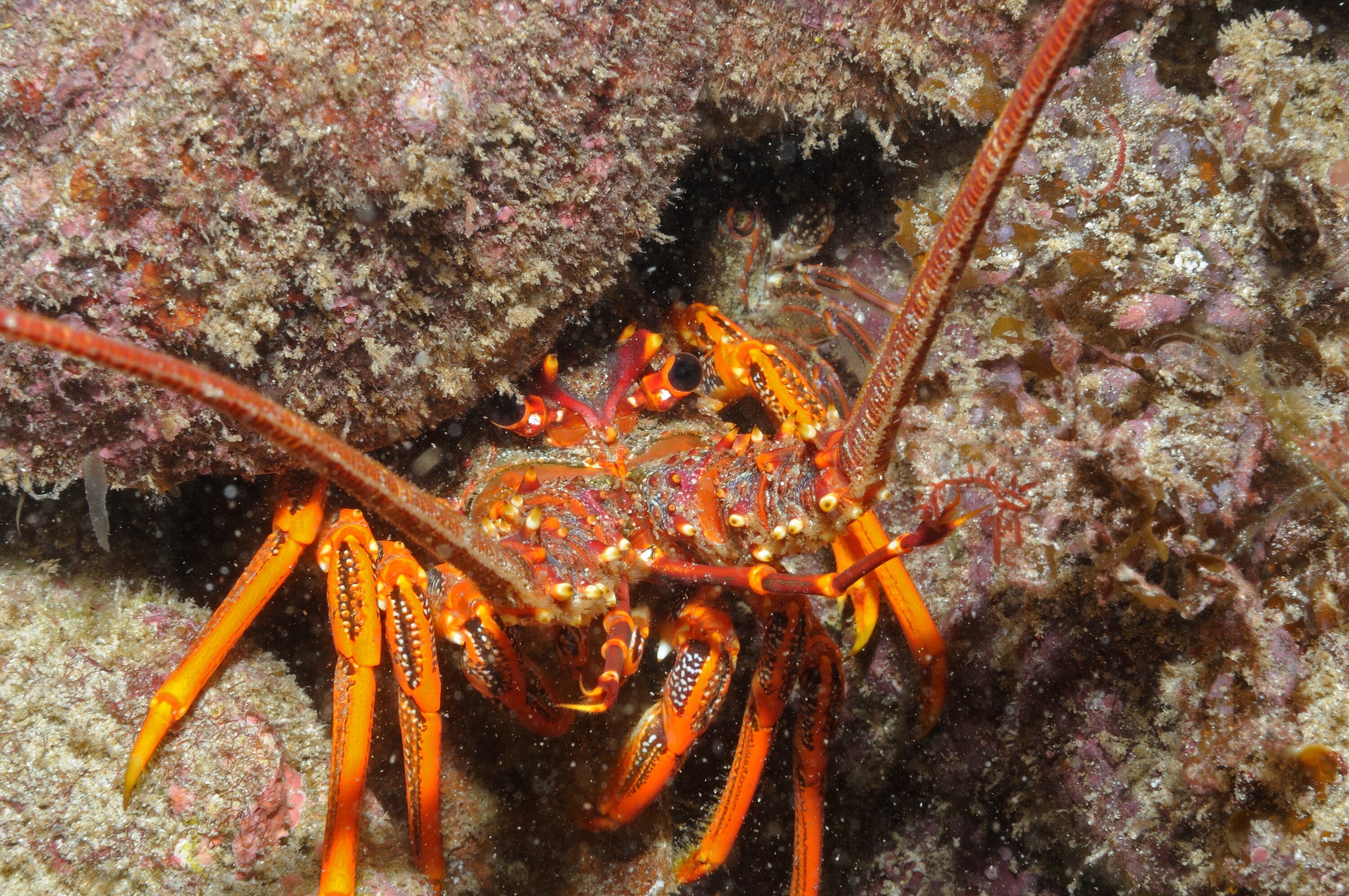 Crevices and ledges of rocky reefs, to depths over 60 m.