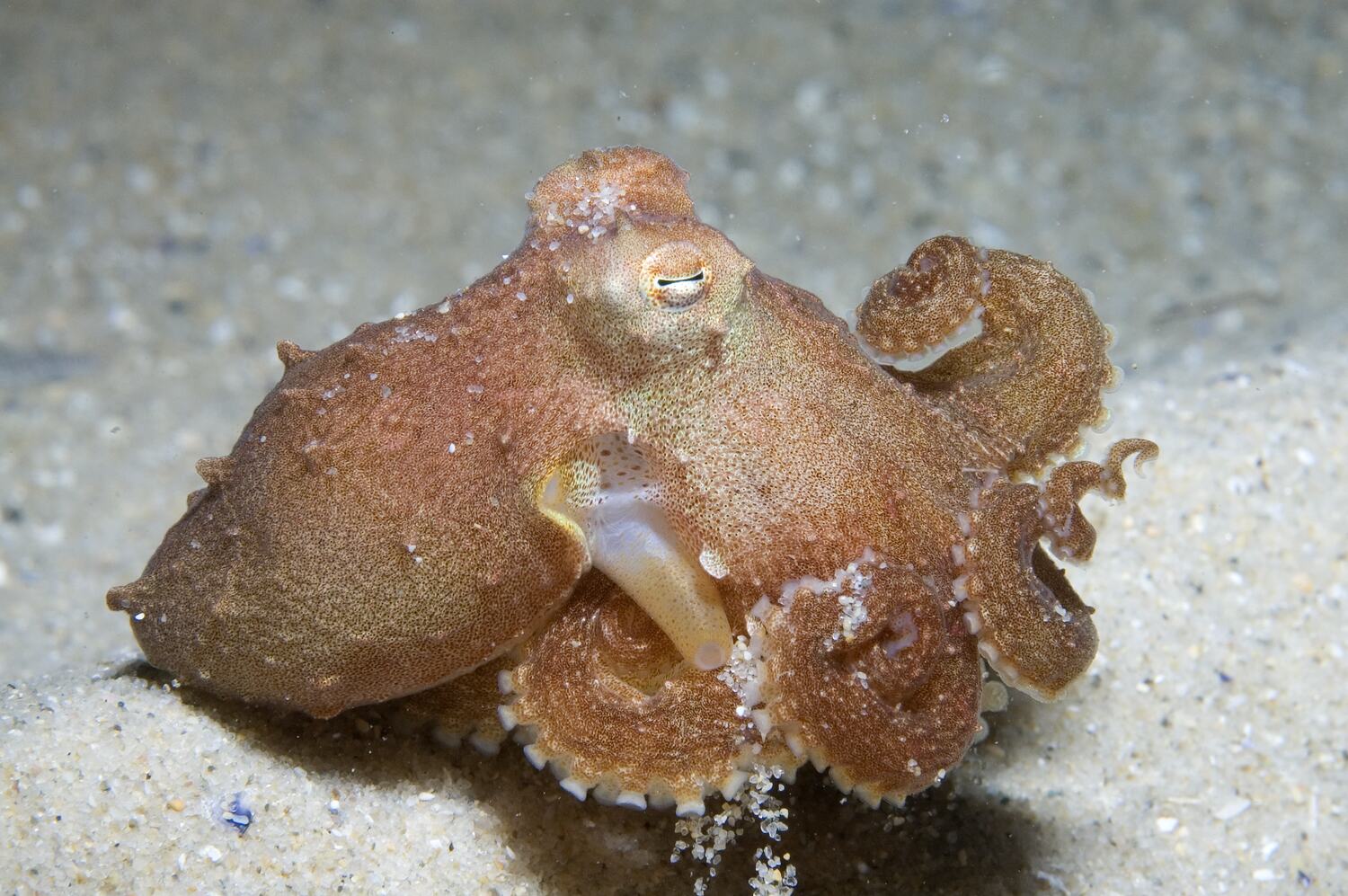 This octopus emerges at night to forage over the sand for crabs and other crustaceans. During the day it buries in the sand or hides in shells or human refuse (such as discarded bottles). When buried, it can raise one eye like a periscope above the level of the sand to check for predators before emerging. The common name of this octopus refers to the ridge of skin around the edge of the body, which may aid in gliding the octopus under the sand when it buries. This octopus buries close to the sand surface so that it can still draw clean water in to its gill cavity in order to gain oxygen. Courtship consists of males standing on their arm tips and flaring the webs as they approach females. They quickly grab the females and use their long thin modified arm tip on the third right arm to pass sperm packages into the female's oviducts. Females lay large single eggs that are attached singly to hard surfaces such as shells or human refuse. The young are well developed at hatching and immediately start foraging on the sea floor. This octopus is caught in low quantities in baitless pot fisheries in bays and inlets in South Australia and Victoria. It is sold for human consumption and as bait.
