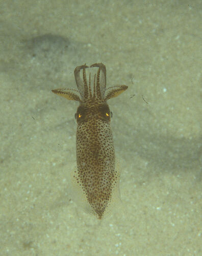Small squat, cylindrical, free-swimming squid. Two large rounded fins on sides of body encompassing the rear half of its length. Fins joined at rear tip to form overall heart shape. Colour pattern of large black, brown and orange dots (chromatophores) over a transparent background. Mantle length to 9 cm, total length to 13 cm.