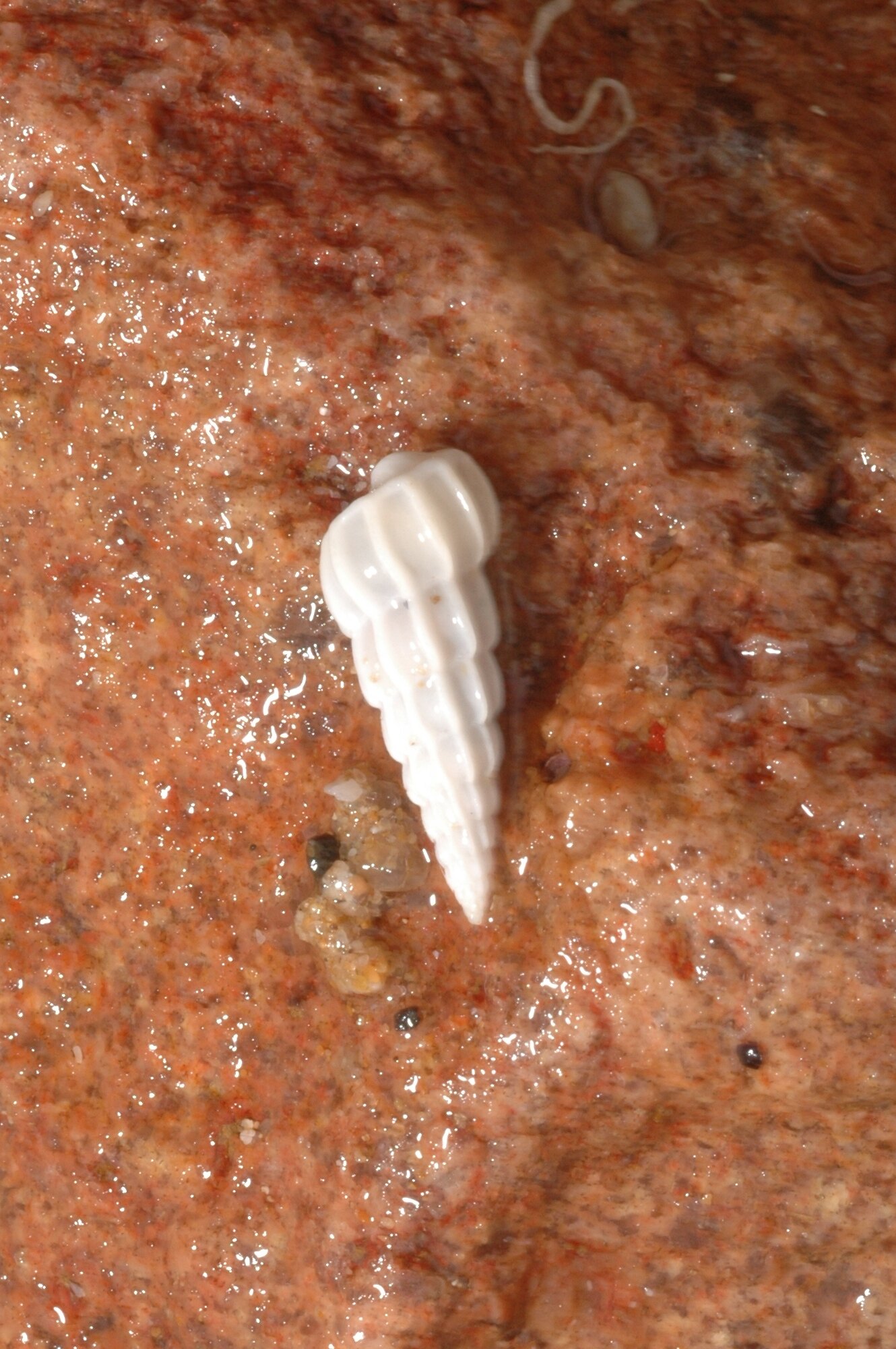 Shell uniformly white-grey with regular thick ribs from the opening to the tip. Opening oval with a thickened lip. Shell up to 4 cm long.