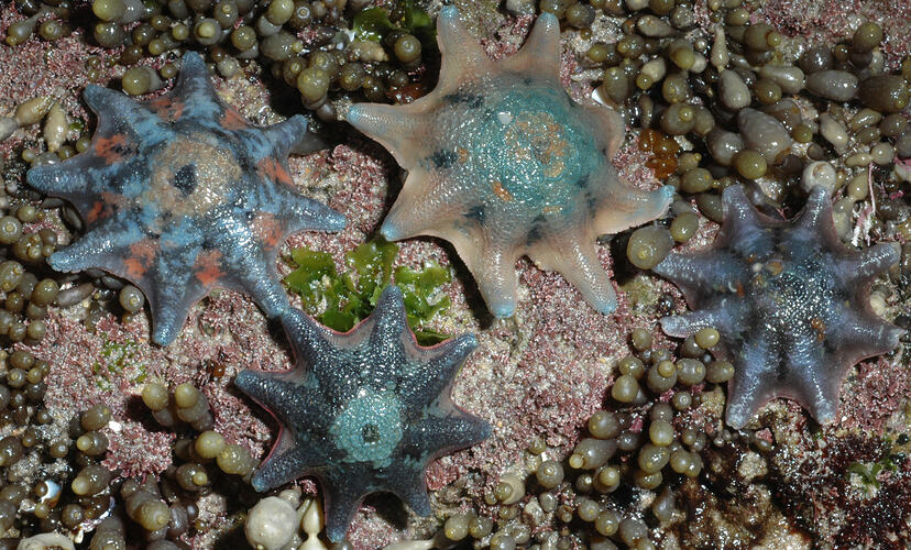 The multi-coloured Eight-armed Cushion Stars feed on everything, from pieces of seaweed to rotting flesh from dead fish, and live bivalves such as mussels. They occur on and under rocks across their habitat.