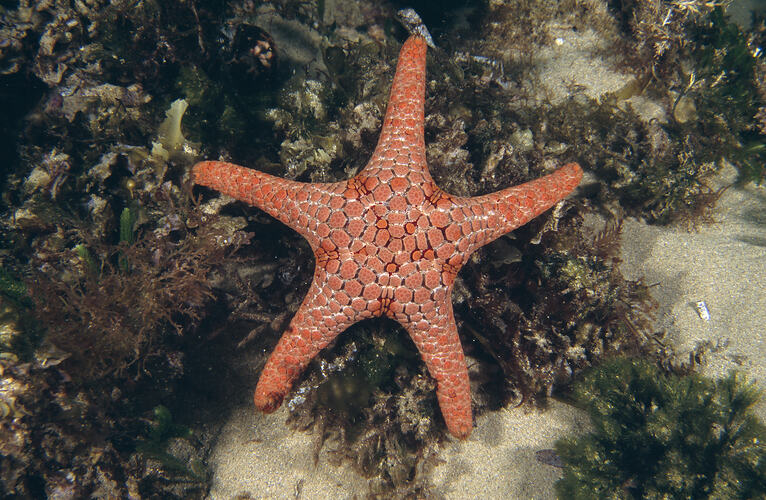 Arms 5, wide at disc tapering to thin tips. Surface covered with separated "tables" each with small wedge-shaped granules around the edge. Disc and arms red to orange, sometimes mottled by some lighter and darker tables. Centre to arm tip up to 13 cm.