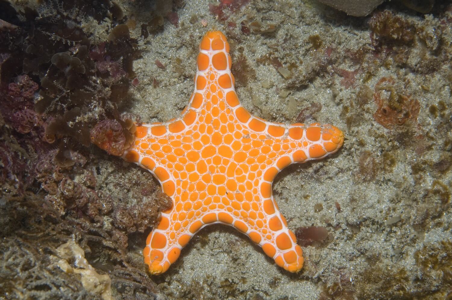 5 arms, deeply incurved so that ends of rays become finger-like arms. Disc and arms uniform red or orange or yellow, frequently with white edges to the dorsal plates. Centre to arm tip up to 8 cm.