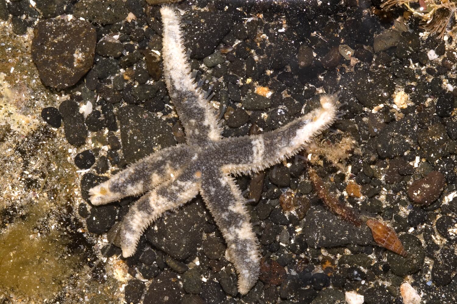 Body with 5 arms, white with black or dark grey patches. Arm up to 4 cm long.