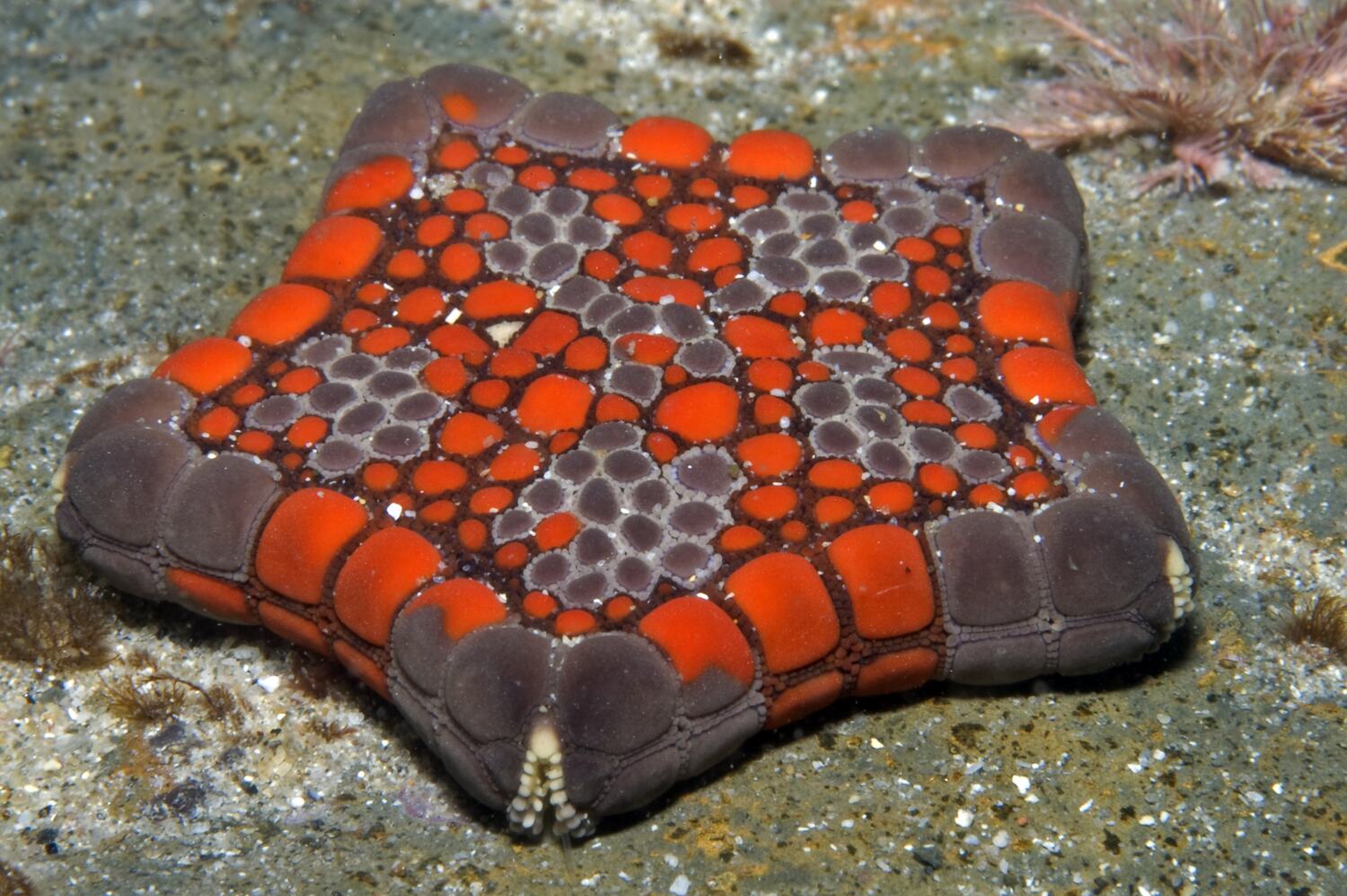 Arms 5, pentagonal, 6 plates along edge between arm tips, oral plates granular, usually two colours.