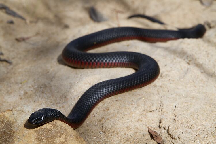 Red-bellied Black Snakes are active during the day. They are usually associated with waterways but sometimes ranging well away from these areas. During the breeding season, in spring, males compete with one another for females. The females produce up to 40 live young when they give birth. Feeds mostly on frogs but also eats reptiles and small mammals. Usually not aggressive but may strike if provoked.