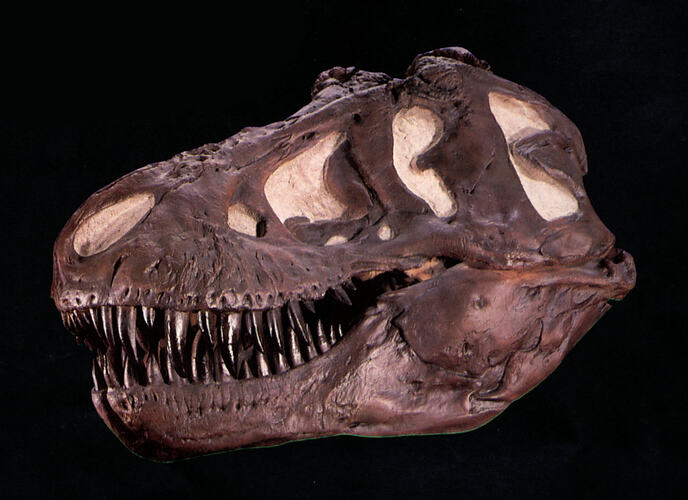 This cast is a copy of the skull of AMNH 5027, the Tyrannosaurus rex specimen on display at the American Museum of Natural History in New York, USA. Museums Victoria acquired this cast in a specimen exchange with the AMNH in 1924. This skull is notable as the basis for the logo of the Jurassic Park film series.