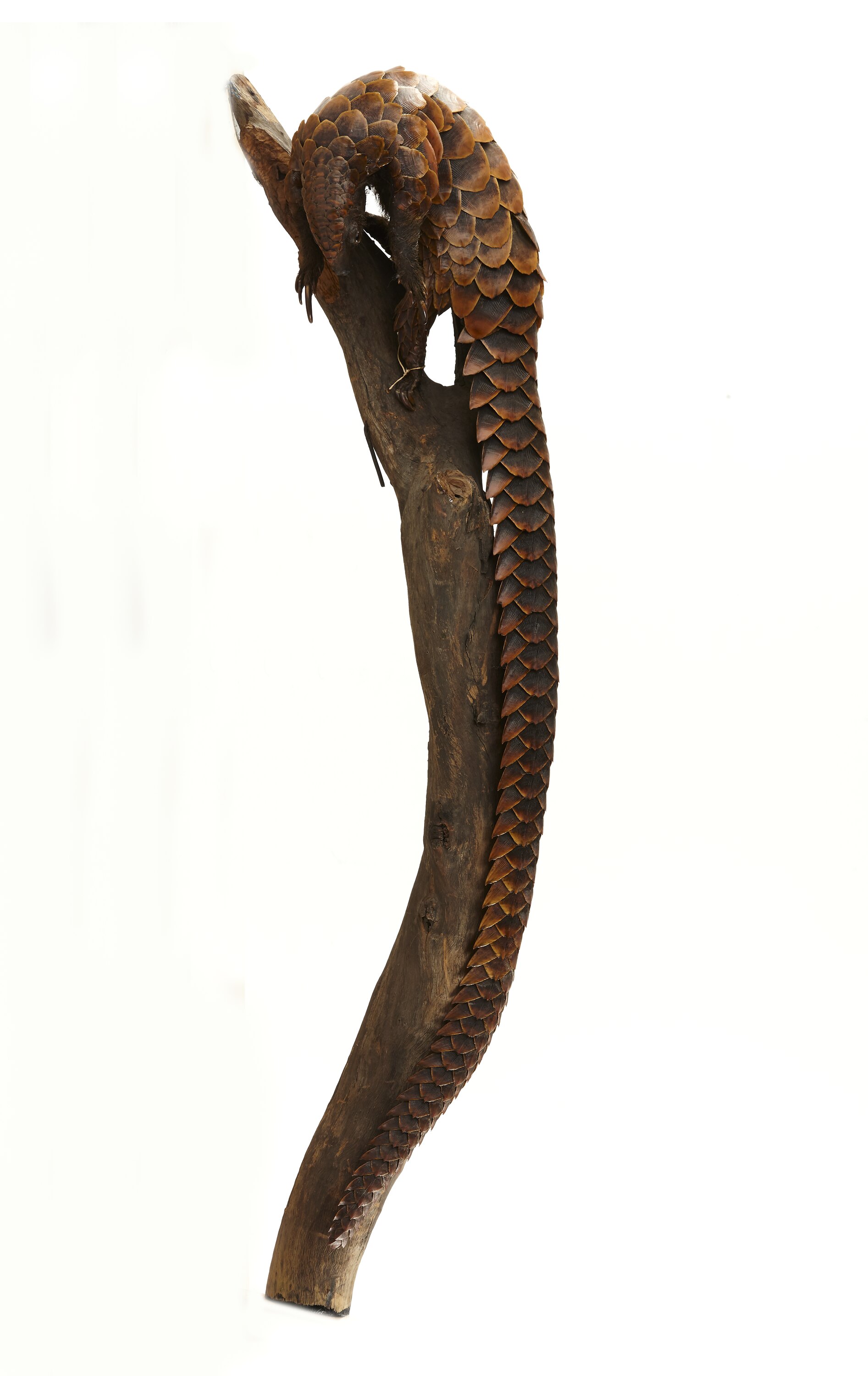 The Long-tailed Pangolin is the smallest of eight species of pangolin, the only group of mammals to be covered by keratin scales. Pangolins occur in Africa and Asia. This species lives in tropical riverine and swamp forests of West and Central Africa. Exactly where this specimen was collected is unknown.