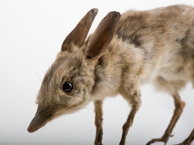 This mounted specimen is currently on display in the Wild exhibition. The specimen was donated to Museums Victoria and it is not known where in Australia it was collected. Until it can be examined more closely by researchers we cannot confirm if it belongs to Chaeropus ecaudatus or the recently discovered Chaeropus yirratji.