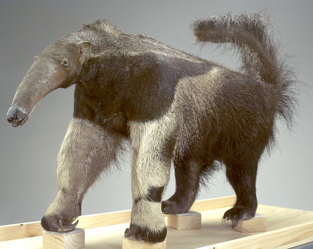The Giant Anteater is one of four species of anteaters. It is native to grassland and rainforests of Central and South Australia from Honduras to Argentina. As its name suggests it largely eats ants but also termites and occasionally other insects. It uses its large claws to dig them up and then licks them up with its long, sticky tongue.