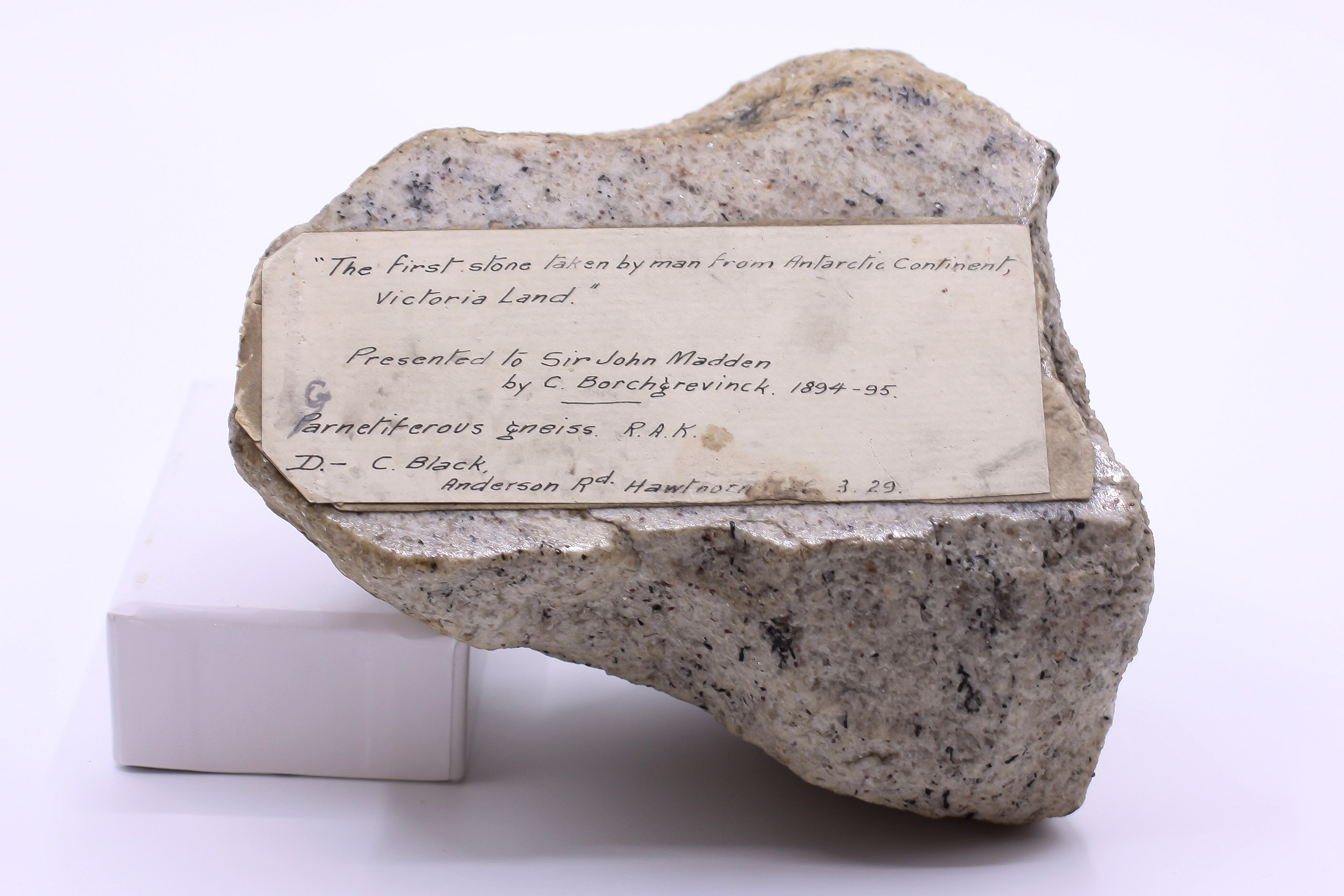 The first rock brought back from Antarctica by Norwegian explorer Carsten Egeberg Borchgrevink in 1895.