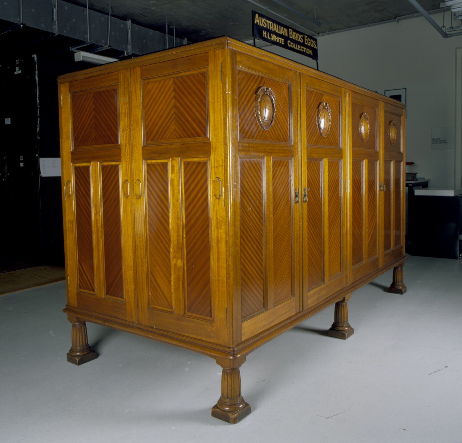 The H. L. White collection of Australian bird eggs remains the finest of its type, with most native species represented. The egg clutches are housed in a magnificent custom-built cabinet made by the famous furniture manufacturer Beard Watson Ltd of Sydney in 1908. The cabinet, made from Queensland Maple (Flindersia brayleyana), a tree native to rainforests of northeast Queensland, is divided into eight sections housing about 4,300 clutches, totalling nearly 13,000 eggs, in 137 glazed drawers.