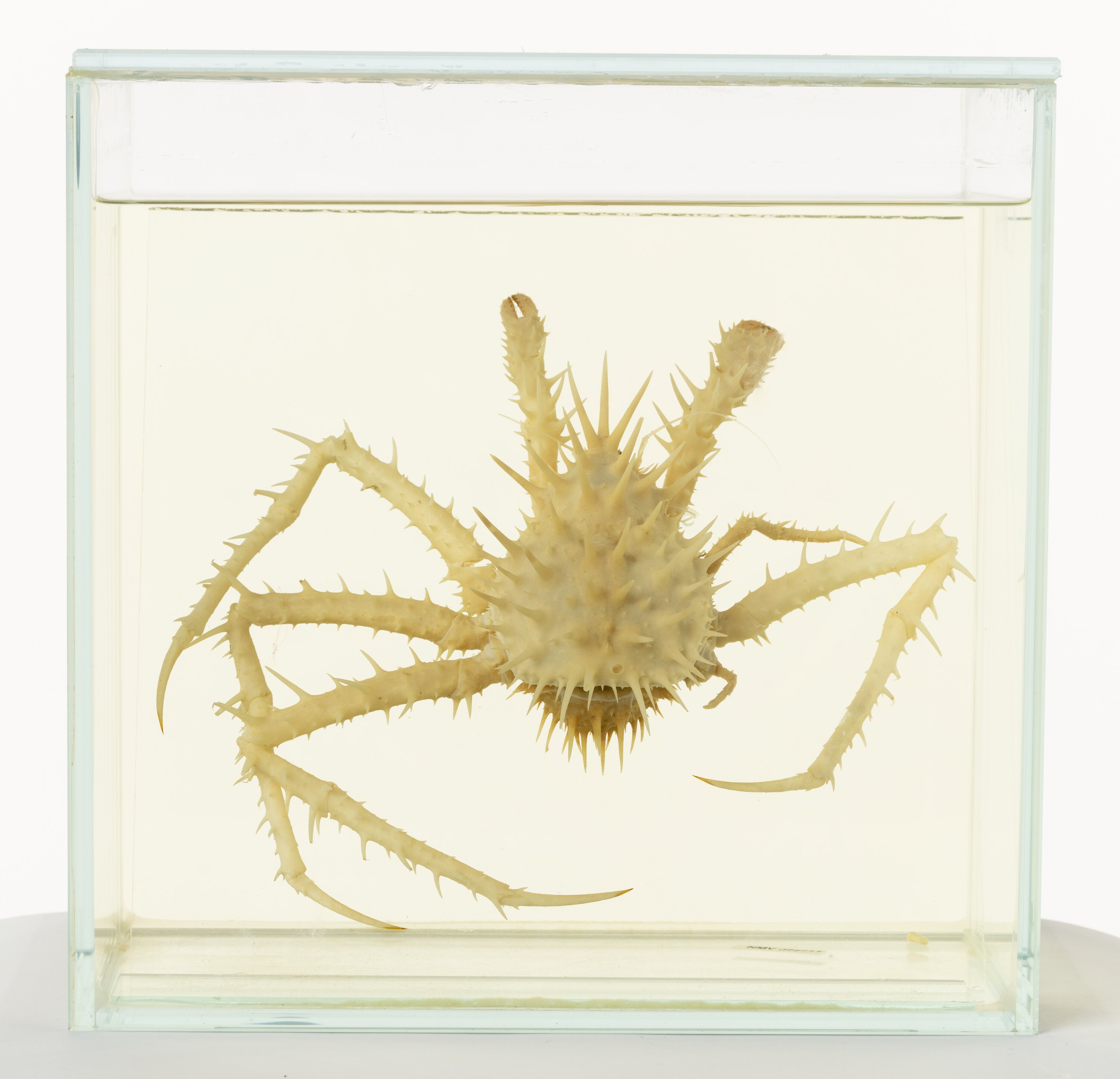 This Spiny King Crab came from a depth of ~2500 meters in the East Gippsland Commonwealth Marine Reserve during the 'Sampling the Abyss' expedition. In the deep sea red colours actually look black, so this crab would have used its colour to hide, and its sharp spikes to protect itself as it moved across the seafloor looking for food. This specimen was one of the stars of 'World Ocean Day' when scientists on board revealed it to Australian school children in a live cross from the RV Investigator. It was also featued on a coin in the 2023 Royal Australian Mint Creatures of the Deep Coin Program.