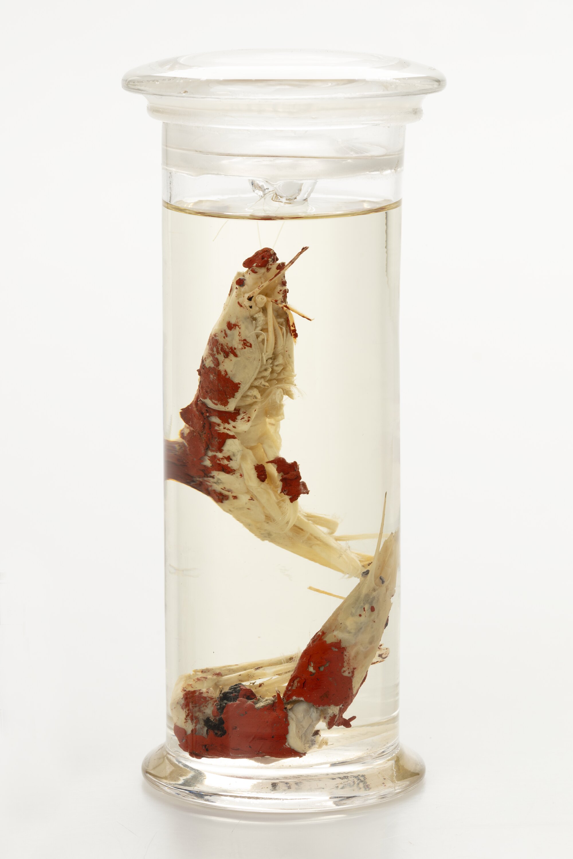 These specimens were collected off Bermagui, New South Wales during the 2017 'Sampling the Abyss' expedition. Like many deep-sea animals, Nematocarcinus sigmoideus are bright red in life, but the preservation process causes specimens to lose their colour. However, these shrimp were found lodged inside a discarded paint can on the sea floor, and the red paint can still be seen coating them.