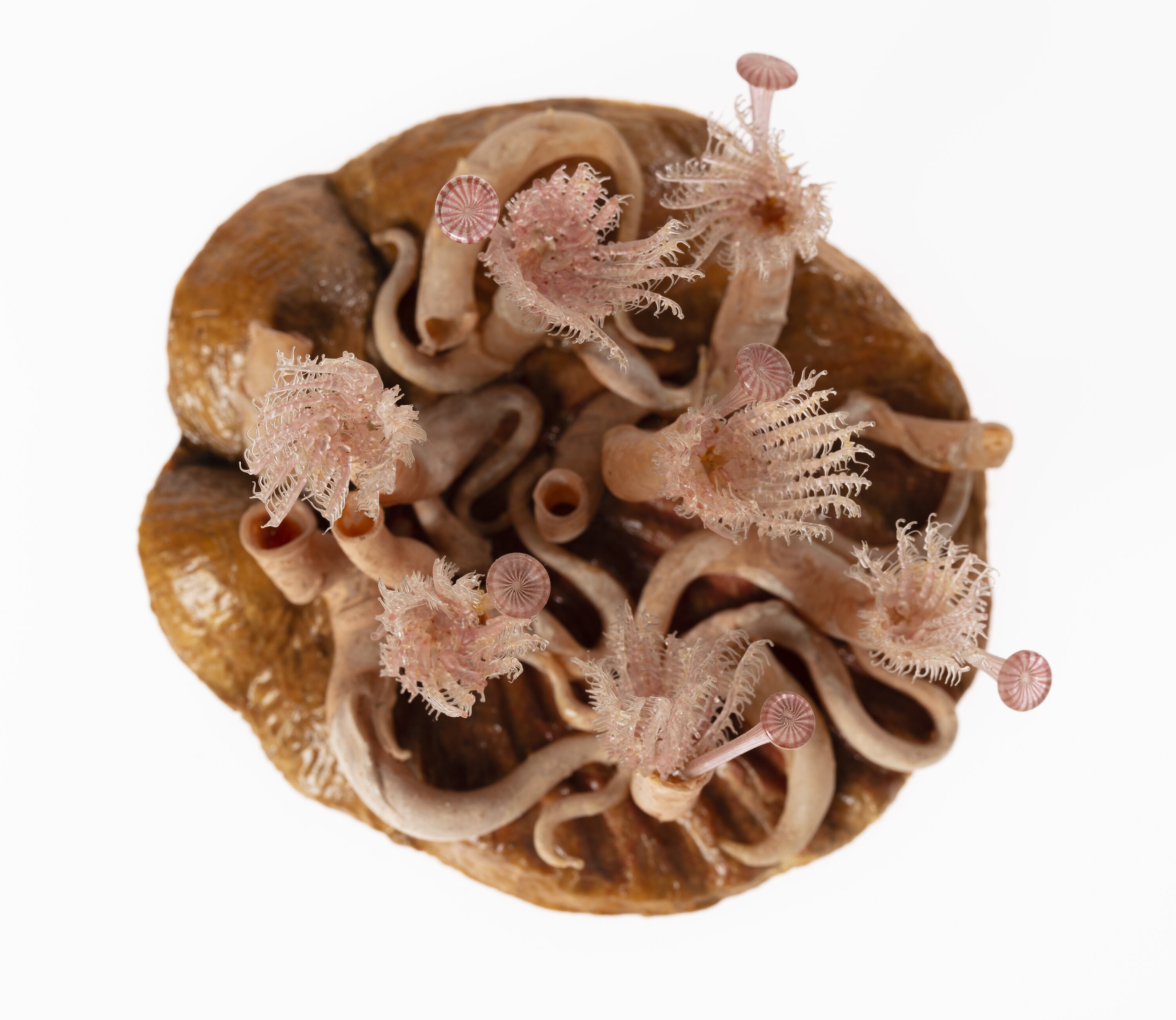 This spectacular model is the work of the Blaschka father and son team of German glass artists, who created many models of soft-bodied marine life. The subject of the model, Serpula vermicularis, is a small tube worm, typically a few centimetres long in life, but microscopic examination reveals intricate structures well-suited to the sculptural skills of the Blaschkas, who clearly observed their subjects in great detail.