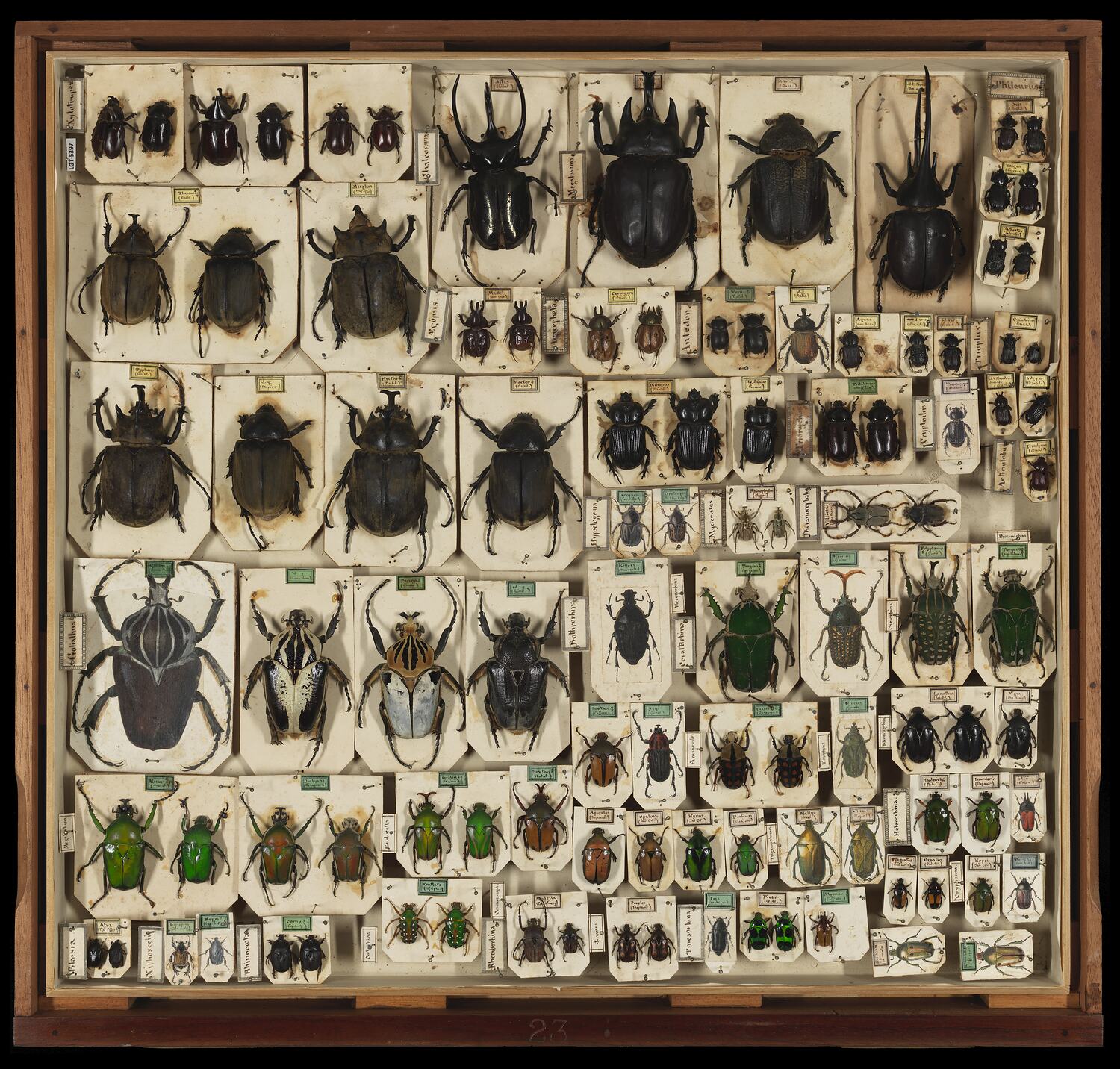 Castelnau Collection of Scarabaeidae, scarab and dung beetle specimens displayed in a drawer on pinned-down cards, with hand-written labels . Where actual specimens were not available, they have been represented by images cut out from a book.