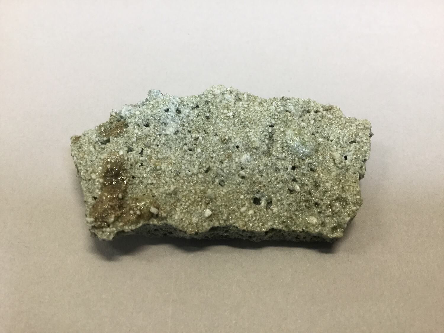 Flat piece of greenish glass with sand grains adhered to upper and lower surfaces.