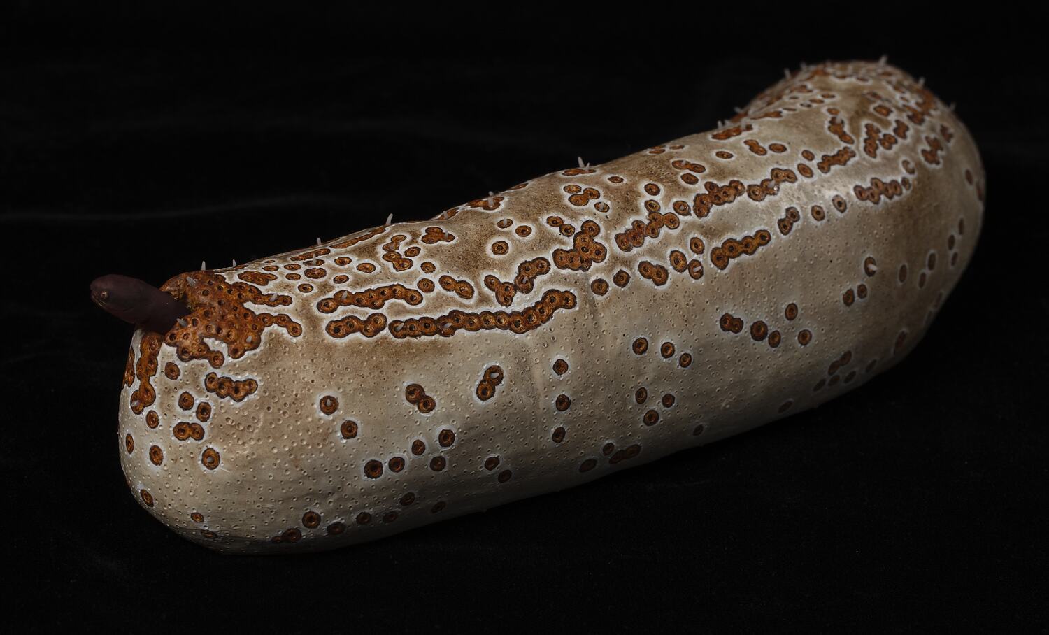This model of a Leopard Sea Cucumber was made by the Museum's Preparators. A Pinhead Pearlfish can be seen protruding from the anus. Pearlfish are tropical fish found around the world, including around Australia. They all live within other animals, including bivalves, corals, and sometimes sea cucumbers, staying hidden during the day and emerging at night to feed.