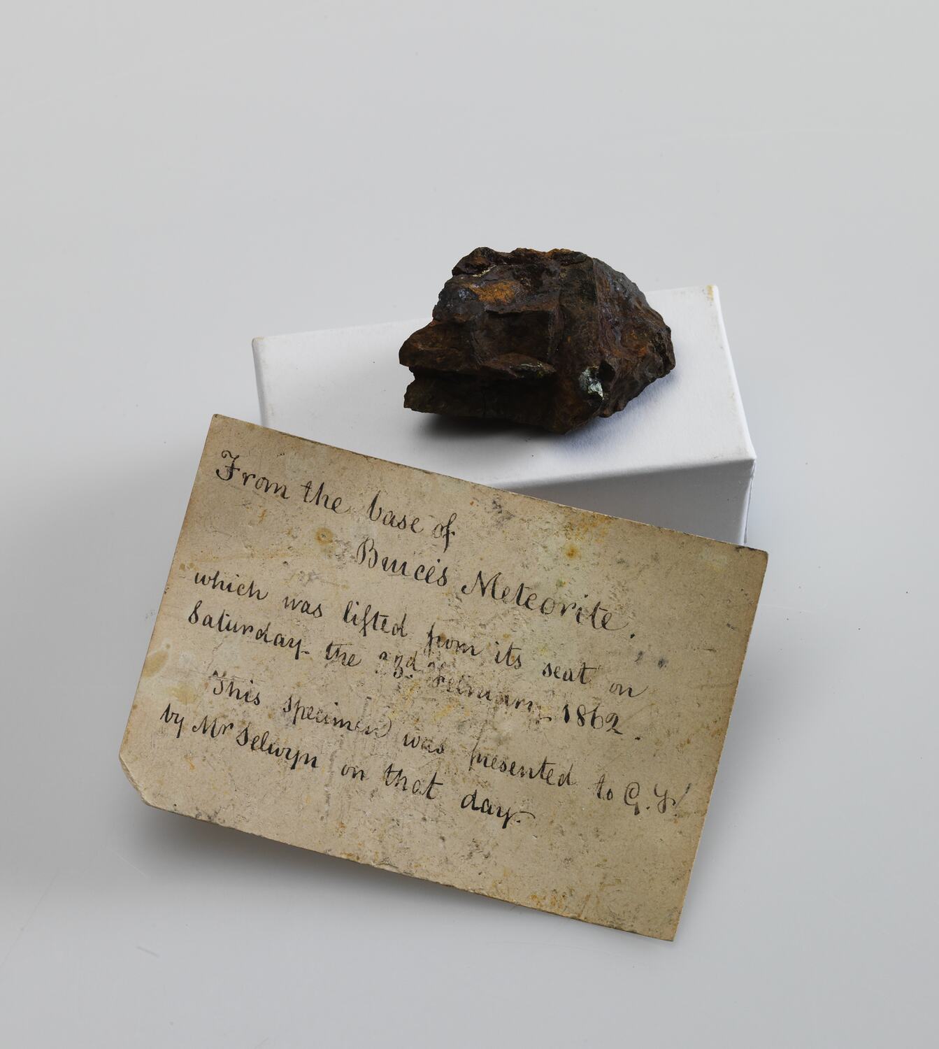 This small sample along with another was taken from the base of Cranbourne No. 1 Meteorite by Alfred Selwyn on the 23rd of February 1862 when extracting and transporting it to the Museum (then situated on the ground of Univeristy of Melbourne). The 3.5 tonne meteorite remained on display outside the university quandrangle for the next three years. During this time it was the highly coveted prize at the centre of a tug-of-war between British and colonial scientists and government.