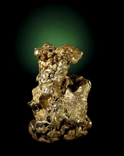 Gold nuggets are a feature of the Victorian goldfields, both historically and at present; fossickers with metal detectors are uncovering nuggets missed by the early gold diggers. While the Bunyip nugget, weighing 1.55 kilograms (50 ounces), is only small by Victorian standards, very few of similar dimensions survive in museum collections. The nugget was ploughed up by a farmer near Bridgewater, west of Bendigo. Its location, close to the Loddon River and well away from other nugget finds, suggests the Bunyip nugget might have been carried some distance by Aboriginal people. It was purchased by the National Museum of Victoria in 1978 for $40 000.