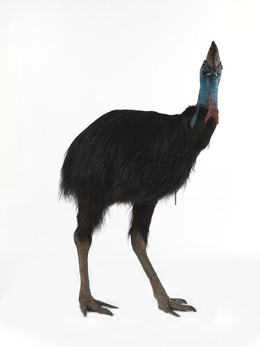 The Southern Cassowary is a very large ratite, meaning it belongs to the group that includes Emu, Kiwi, and ostriches. Like all ratites, it is ground-dwelling. Its wings are extremely reduced and it cannot fly. Adults have black feathers and a bright blue neck with a red nape and large, obvious red wattles hanging from the front. This specimen is thought to be a male because of the length of its wattles. It naturally occurs in rainforests in New Guinea (east Indonesia and Papua New Guinea) and north-eastern Australia.