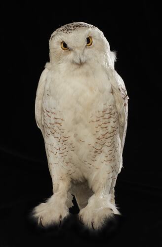 While mostly white, Snowy Owls vary in the extent of black feather markings; the oldest males have the whitest feathers while young females display more dense, dark feathers. The species breeds in the Arctic tundra, with females creating a nest by scraping a shallow bowl from bare ground. Their diet consists primarily of lemmings, other voles, and mice, which they also feed to their young in the nest.