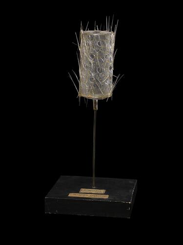 This Blaschka glass model of a sponge Sycon raphanus represents an early stage in its development. It is one of a series of models demonstrating the developmental biology of sponges. Sponges begin life as free-swimming larvae. After settling onto a suitable substrate the sponge will continue to develop and grow. During the stage modelled here, the body becomes more cylindrical in shape and spicules made of calcium carbonate begin to form within the body walls, providing structural support. Pores and openings on the body surface allow water to be drawn in and expelled, bringing food particles with it. Sponges have no true tissues or organs, and are one of the oldest and simplest life forms on Earth.