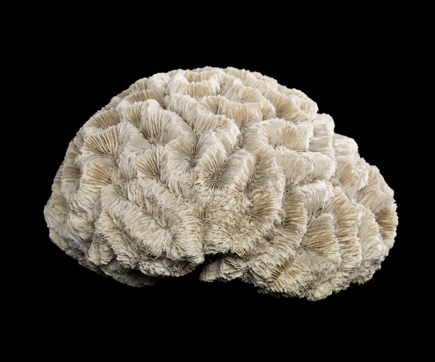 This coral is from the group of corals called brain corals because the sinuous folding shapes of their surface look rather like the surface of a brain. This species, Lobophyllia recta, belongs to a family called the lobo or lobed brain corals. These are stony corals that build a hard skeleton of calcium carbonate. While the hard dry skeleton is all that is seen here, when alive it would have been covered by a colony soft-bodied polyps. When the polyps have their tentacles pulled in most lobo corals look brown or cream but when their tentacles are out to feed they show off a range of colours, from blues and greens to reds, oranges, pinks and purples, often over the same colony. This species would usually be grey, brown and green.