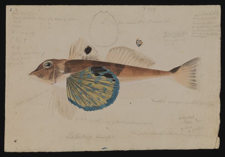A Butterfly Gurnard, from Hobson Bay, Port Phillip, August 1864, illustrated (D379) by Arthur Bartholomew, August 1864, for Plate 5 in The Prodromus of the Zoology of Victoria, by Frederick McCoy.