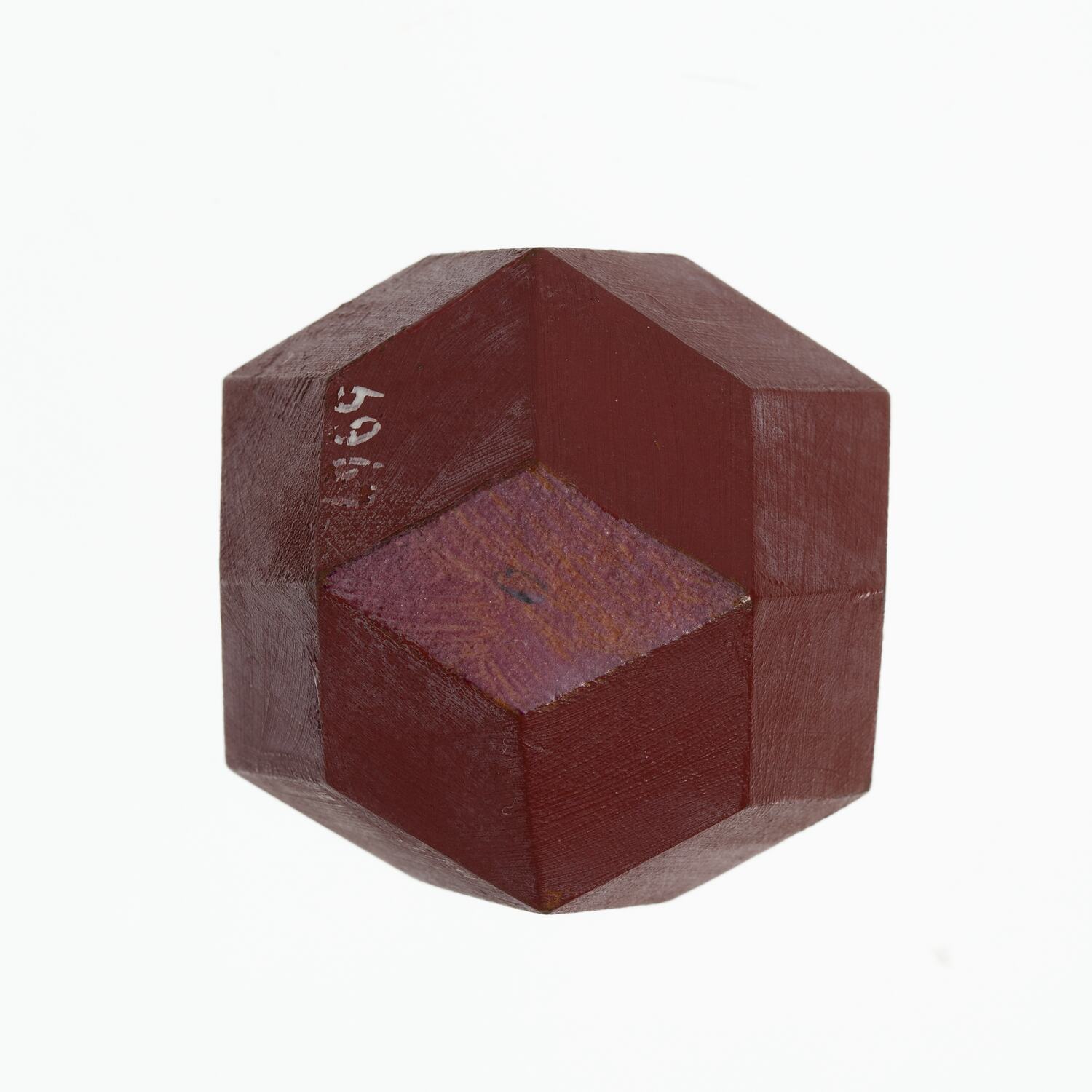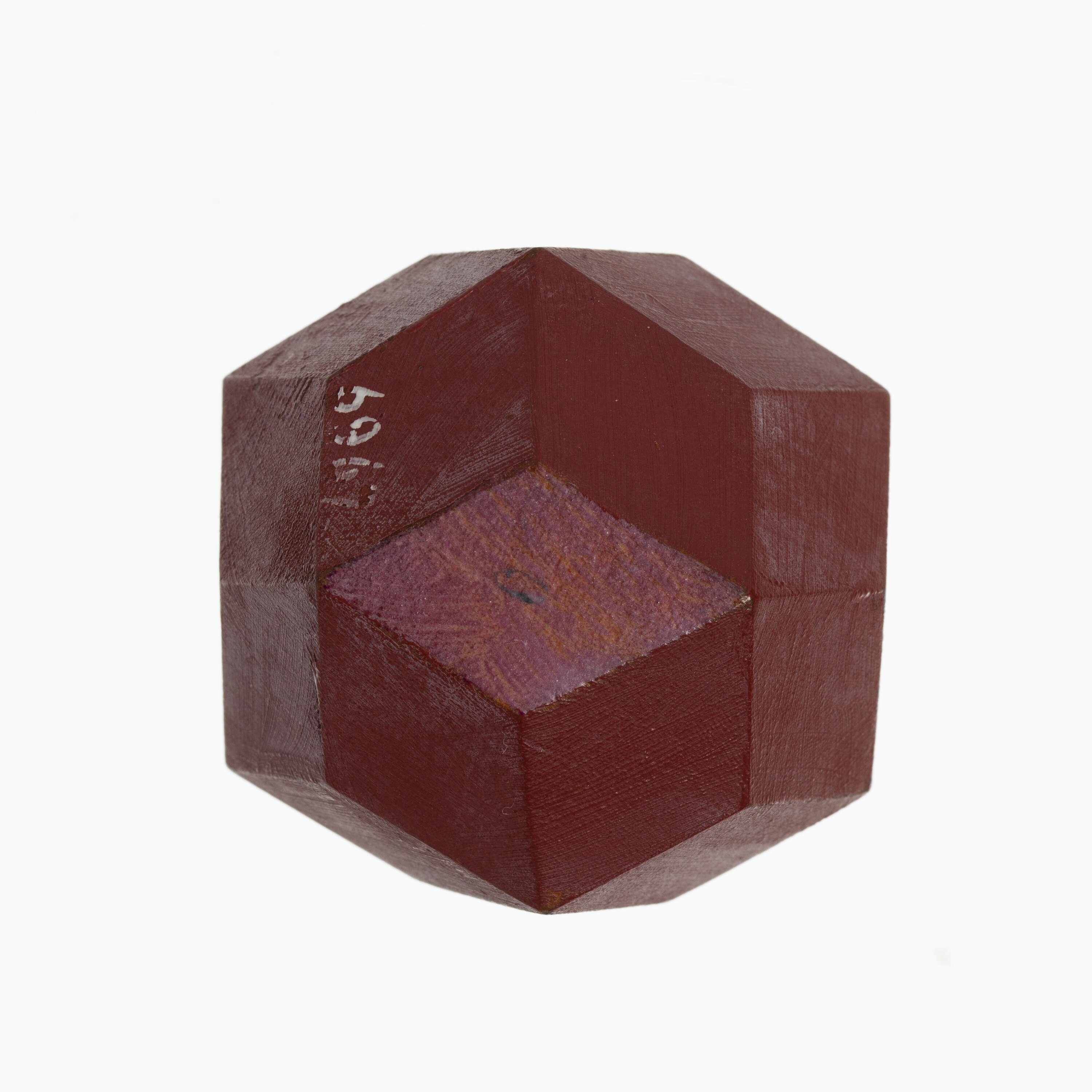 There are six crystal families into which minerals and other crystalline materials can be categorised; cubic, orthorhombic, monoclinic, tetragonal, triclinic, and hexagonal. The model M 6967 is an example of a crystal habit that is exhibited by crystals in the cubic crystal family. Pyrite is a mineral that commonly displays the habit illustrated by M 6967. This model was purchased in 1857, making it one of the earliest items added to Museums Victoria's collections.